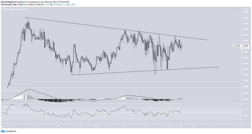 Le token CEL se négocie à l’intérieur d’un triangle symétrique, ce depuis le 9 avril. Il a validé les lignes de résistance et de support de cette figure. Le triangle symétrique est considéré comme une figure neutre.