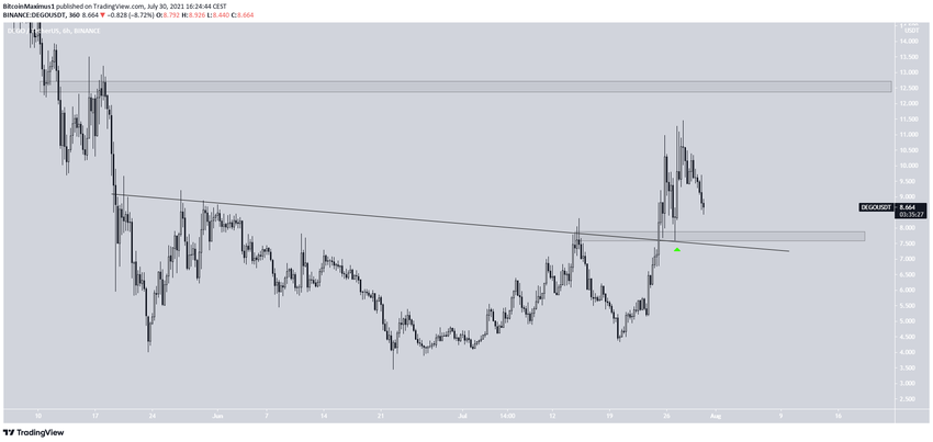 Ensuite, le cours a validé cette ligne ainsi que la zone située à 7,80$ en tant que support (flèche verte). Il a ensuite atteint un sommet de 11,45$ le 28 juillet.