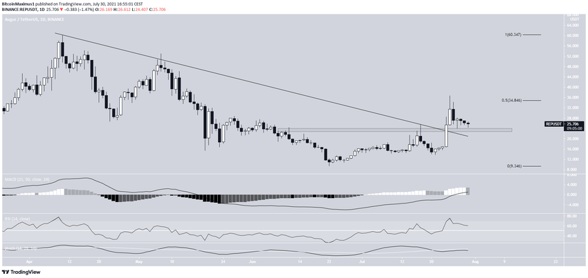 L’altcoin REP est en hausse depuis le 22 juin. Le 24 juillet, il a dépassé une ligne de résistance descendante qui était en place depuis le 10 avril. Cela a conduit à un sommet de 36,51$ atteint le jour suivant.