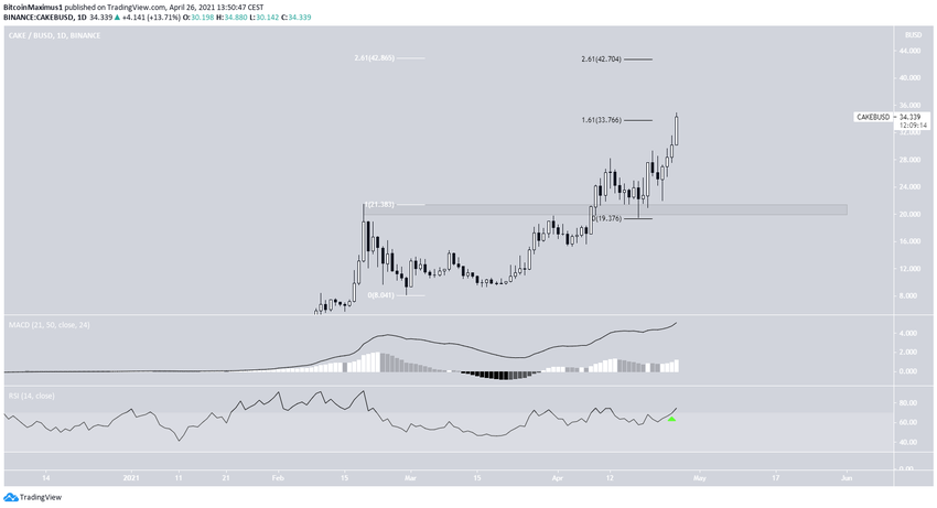 Le 26 avril, le CAKE a atteint un nouveau cours record de 34,88$. Ce sommet se situe juste au niveau de retracement fibonacci externe 1,6 de court terme.