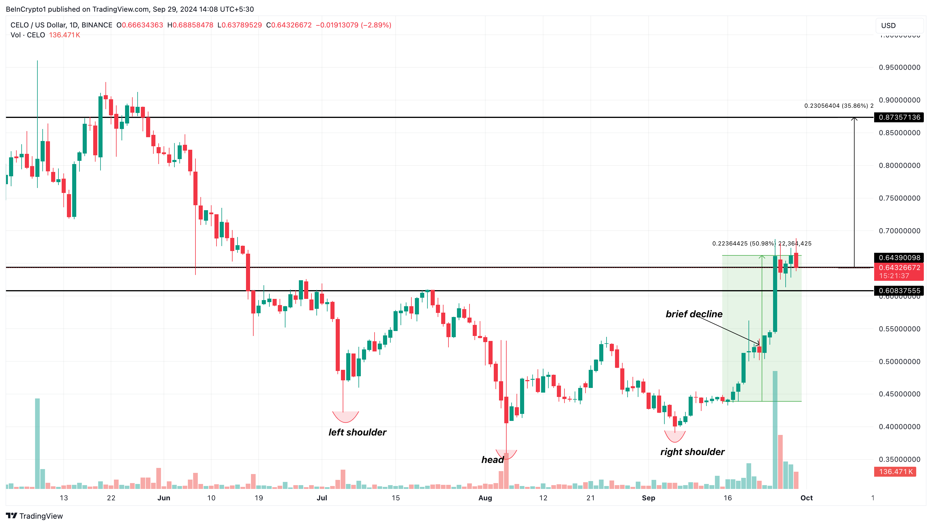 SponsoredBasé sur le graphique journalier, le cours de CELO a grimpé de plus de 50 % en moins de deux semaines après la formation d’un modèle de tête et épaules inversé. Ce modèle technique consitue un revirement de baissier à haussier, qui entraîne généralement de fortes hausses du cours de l’actif en question.