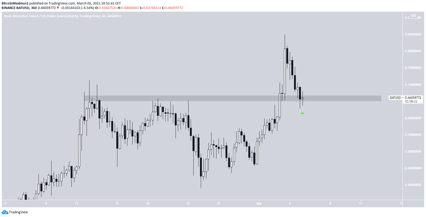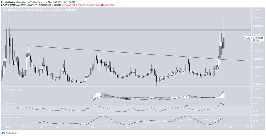 L’altcoin BAT est en hausse depuis qu’il a dépassé une ligne de résistance descendante de long terme, laquelle a ensuite été validée comme support. Cela s’est produit la semaine dernière. Le BAT a ensuite considérablement rebondi, atteignant un sommet de 0,87$ cette semaine.