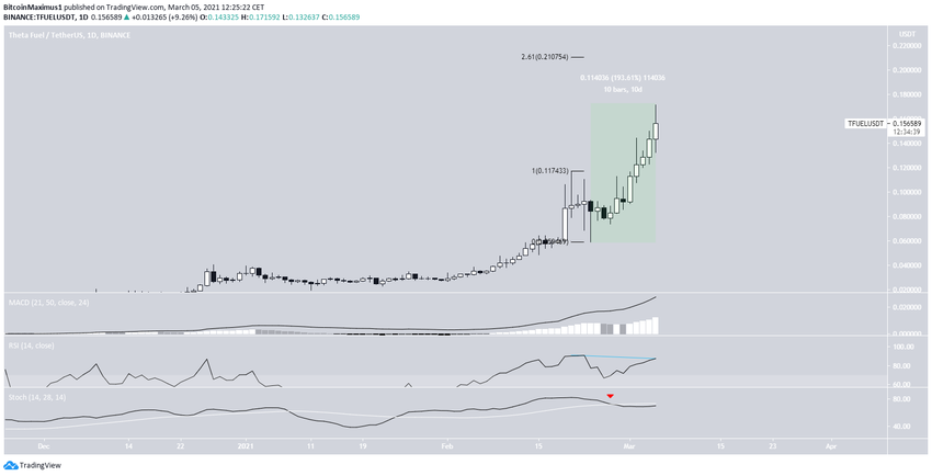 Le TFUEL est en hausse depuis le 23 février, après avoir atteint un creux de 0,059$. La hausse s’est poursuivie jusqu’à un nouveau cours record de 0,171$, atteint le 5 mars. Il s’agit d’une hausse de près de 200% en dix jours seulement. Depuis, le cours du TFUEL a légèrement diminué.