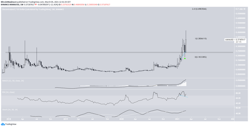 Début février, l’altcoin MANA a dépassé la zone de résistance de son ancien sommet historique à 0,235$. Après avoir retesté le niveau comme support, il a amorcé un rebond. Cela a conduit à un nouveau cours record de 0,468$ le 4 mars.