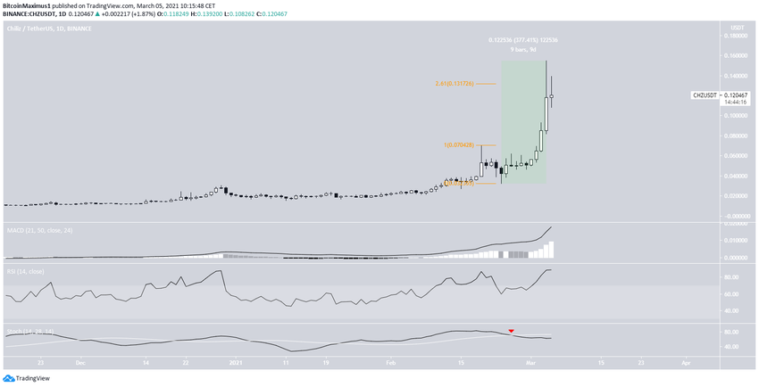 L’altcoin CHZ a été le plus grand gagnant de la semaine, avec une augmentation massive de 377% en neuf jours. Le 4 mars, il a atteint un cours record de 0,155$, mais n’a pas réussi à s’y maintenir.