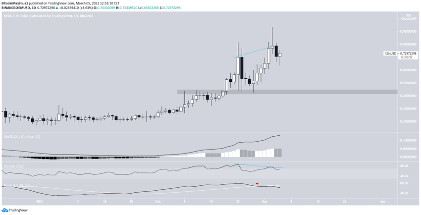 Le XEM a atteint un sommet local de 0,93$ le 3 mars, mais a ensuite créé un chandelier en forme d’étoile filante et a depuis diminué.