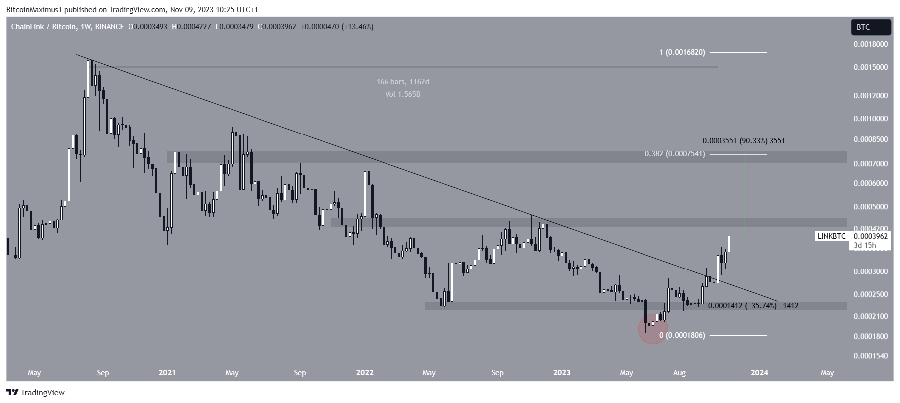 Cependant, le cours LINK a fortement augmenté depuis. Après avoir récupéré son support de 23 000 satoshis, l’actif a accéléré son ascension en septembre. En octobre, il a franchi une ligne de résistance descendante.