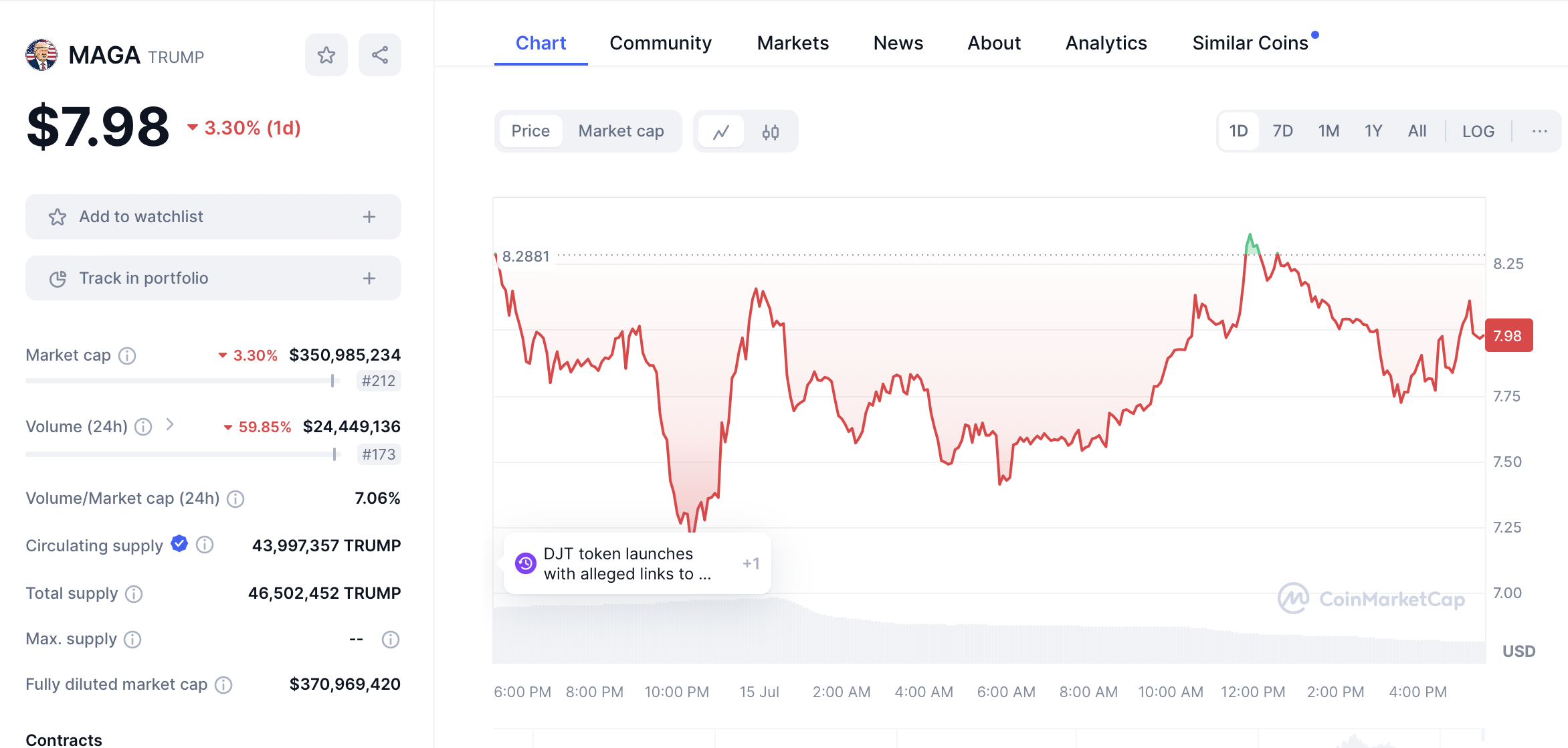 Malgré le rebond du marché, les altcoins TRUMP n’explosent pas pour autant après l’incident. D’après les données recueillies sur CoinMarketCap, le cours du jeton MAGA (TRUMP) affiche une baisse de 3,30 % sur les dernières 24 heures. Même si, sur une base hebdomadaire, le constat est très différent avec une hausse de 40,56 % sur les sept derniers jours.