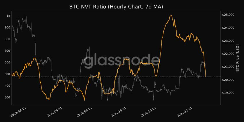 Sponsored SponsoredTout d’abord, l’indicateur du ratio NVT de Bitcoin (7d MA, ou MA sur 7 jours) a atteint son niveau le plus bas sur un mois, à savoir 475. Les faibles valeurs du ratio NVT signifient que les investisseurs évaluent le BTC à un cours réduit.