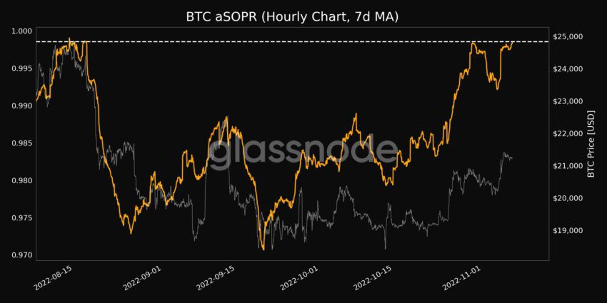 Cela dit, l’indicateur aSOPR (7d MA) de Bitcoin a atteint un sommet d’un mois à 0,99856 ce 7 novembre. Au niveau des sommets locaux du cours, une valeur aSOPR supérieure indique que l’ampleur du profit réalisé augmente à chaque rallye.