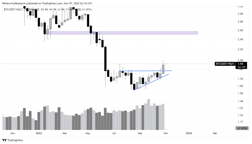 L’analyse Will Clemente a noté que dans le graphique BTC/Nasdaq, la clotûre de la bougie hebdomadaire indique que le BTC a réalisé une percée par rapport au cours du Nasdaq.
