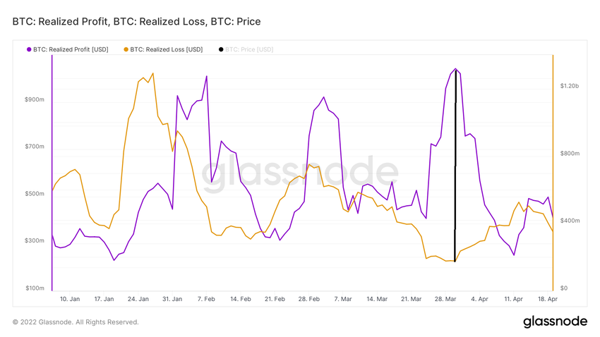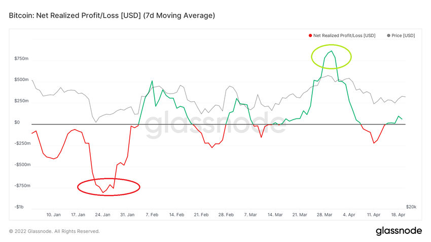 En décembre 2021 et février 2022, les pertes réalisées sur Bitcoin ont culminé à près de 1,05 milliard de dollars (cercles rouges). Cela a probablement été causé par les acheteurs lors du sommet record, qui ont acheté l’actif à des prix supérieurs à 60 000 dollars en novembre 2021.