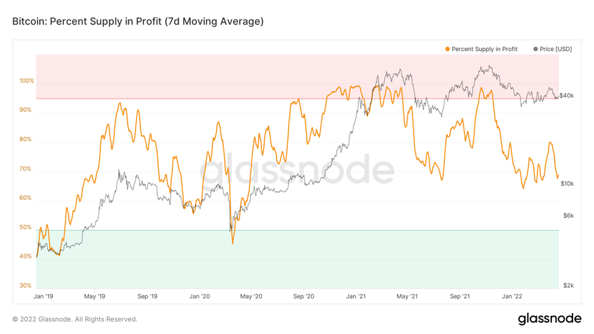 Enfin, l’indicateur du pourcentage de l’offre en profit indique le pourcentage de l’offre totale de BTC en circulation qui se trouve actuellement en situation de profit. Au 21 avril, 67,5% de l’offre de Bitcoin est actuellement positive.