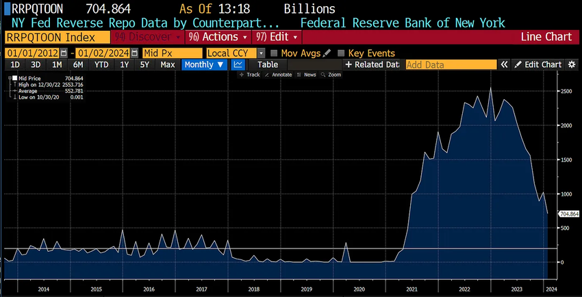 Pour expliquer la correction du marché, Arthur Hayes a cité de nombreux facteurs, notamment la baisse du solde du programme de prise en pension (Reverse Repo Program – RRP). La capture d’écran ci-dessous montre en effet que le solde du RRP a fortement diminué depuis le début de l’année 2023.