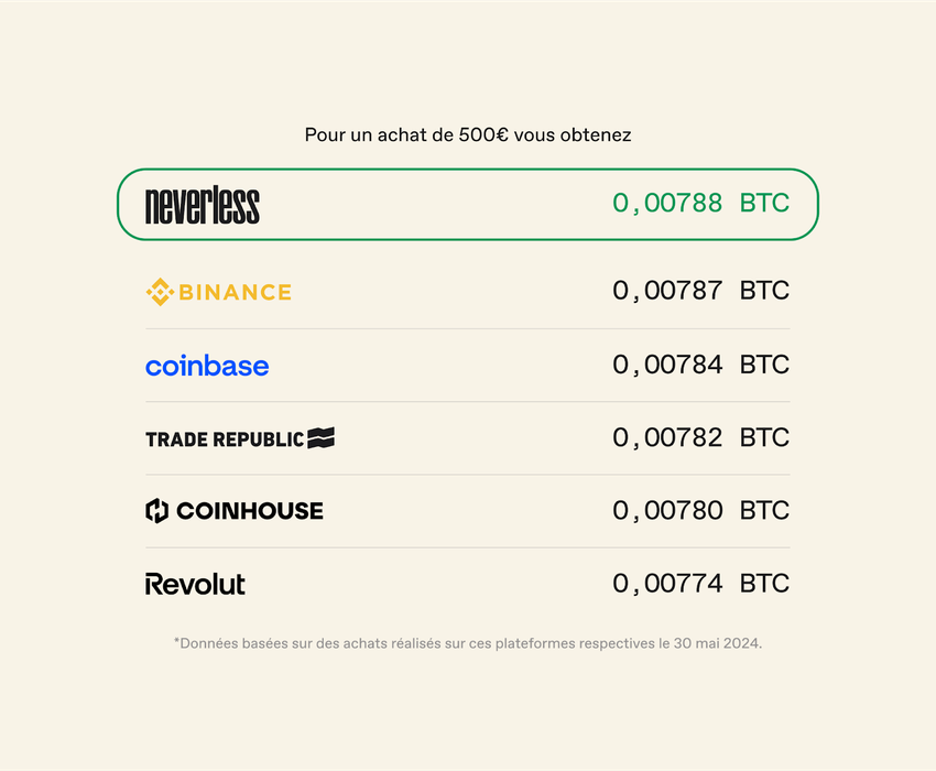 Lors d’un test, nous avons acheté pour 10 000 € de Bitcoin sur une autre plateforme tout en faisant la même chose sur Neverless. Résultat : jusqu’à 1,49 % de Bitcoin en moins a été obtenu sur les autres plateformes que nous avons pu tester.