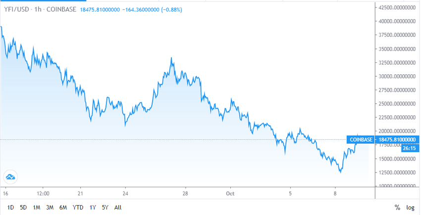 Comme le montre le graphique ci-dessous, le piratage d’EMN du 29 septembre coïncide fortement avec une nouvelle chute brutale du YFI au cours d’un étrange mois de septembre, à la fois haussier et baissier. Le jeton a perdu 67% de sa valeur, passant de 43 000 dollars, son plus haut niveau historique du 12 septembre, à un peu plus de 12 500 dollars.