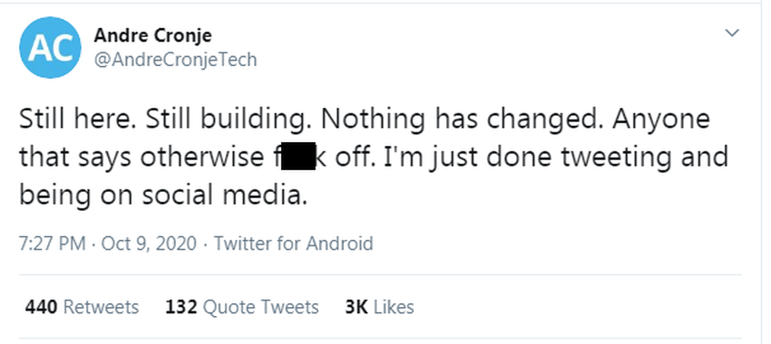 Ce post fait suite à l’incertitude récente concernant la localisation d’Andre Cronje. Dans un tweet posté le 9 octobre, il a révélé qu’il est “toujours là” et “toujours occupé à travailler”, ajoutant qu’il a “fini de tweeter et d’être sur les réseaux sociaux”. Il a conservé son compte Twitter, ce qui suggère qu’il pourrait être de retour.