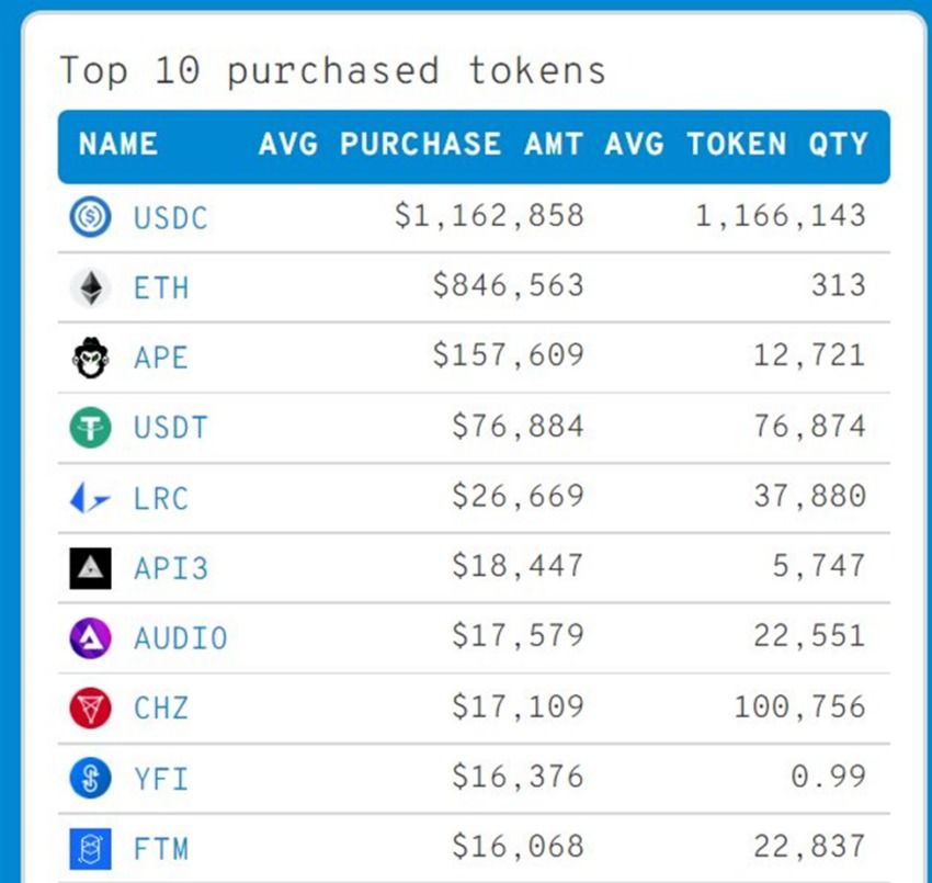 Quelques semaines après son lancement, ApeCoin a dépassé Tether (USDT) et Loopring (LRC) pour devenir la troisième cryptomonnaie la plus achetée par les 100 premiers portefeuilles Ethereum.