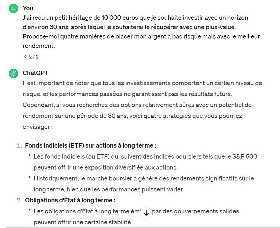 - Prompt : J’ai reçu un petit héritage de 10 000 euros que je souhaite investir avec un horizon d’environ 30 ans, après lequel je souhaiterai le récupérer avec une plus-value. Propose-moi quatre manières de placer mon argent à bas risque mais avec un meilleur rendement que l’épargne classique.