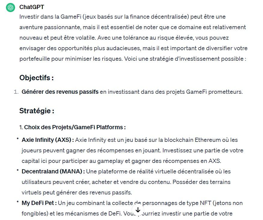- Prompt : J’aimerais investir dans la GameFi pour générer des revenus passifs, mais je n’ai aucune connaissance approfondie de ce domaine. Ma tolérance au risque est élevée. J’aimerais que tu me créées une stratégie d’investissement dans la GameFi. Tu devras me donner un plan structuré en incluant les plateformes ou les projets prometteurs adaptées à mes objectifs et à ma tolérance au risque. N’oublie pas de m’indiquer le capital à investir et le retour que je pourrais avoir.