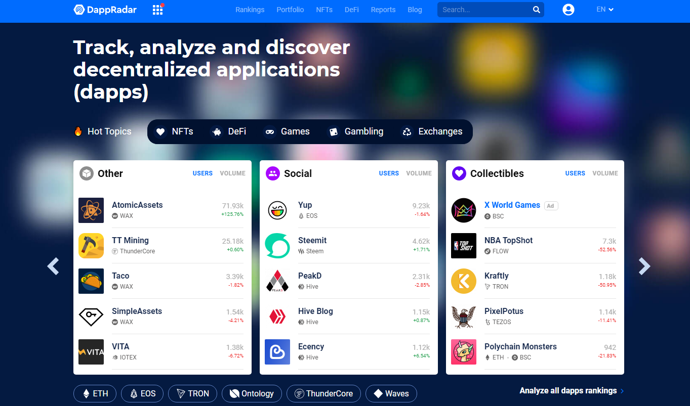 Les développeurs utilisent DappRadar pour chercher et découvrir de nouvelles dApps, tandis que les utilisateurs peuvent se servir de cet outil pour collecter les données nécessaires sur les applications de leur choix avant de passer à l’achat.