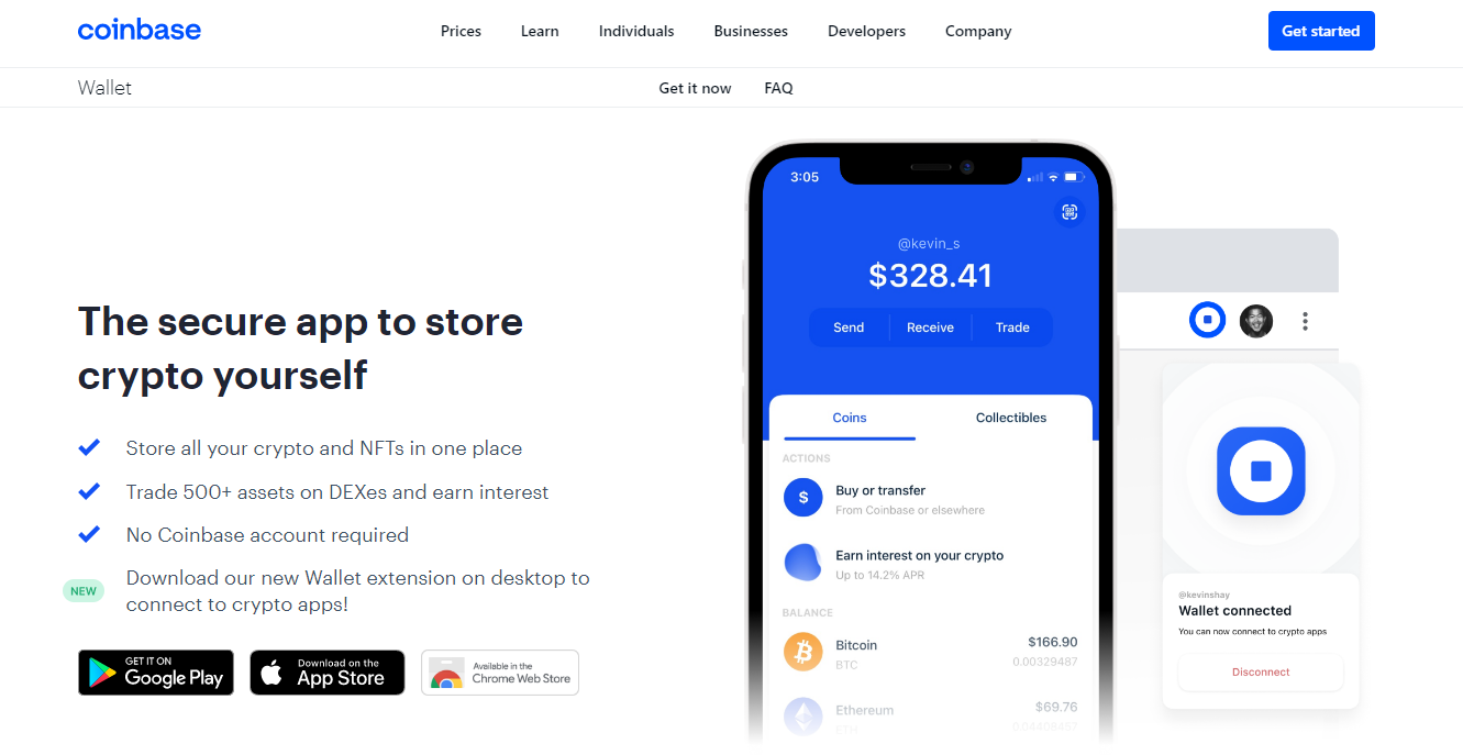 Le portefeuille de Coinbase ne nécessite pas de compte sur Coinbase. Il permet aux utilisateurs de stocker et d’échanger en toute sécurité des fonds et des actifs crypto directement sur leurs appareils. Il leur donne également la possibilité de gagner des intérêts sur leurs fonds crypto.