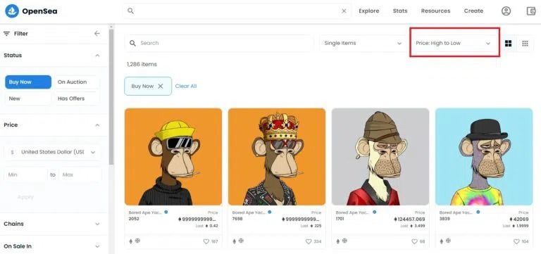 L’achat au prix plafond constitue une excellente option si vous avez assez d’argent à investir dans les NFT, car ces actifs sont rares et très recherchés. Cela signifie que leurs prix peuvent augmenter s’il y a plus de demande pour le projet. Ces articles sont également populaires sur les plateformes NFT, où les gens peuvent trier les jetons non fongibles du prix le plus élevé au prix le plus bas. De plus, étant donné qu’il s’agit là des meilleurs NFT du projet, ils bénéficient de plus d’exposition.