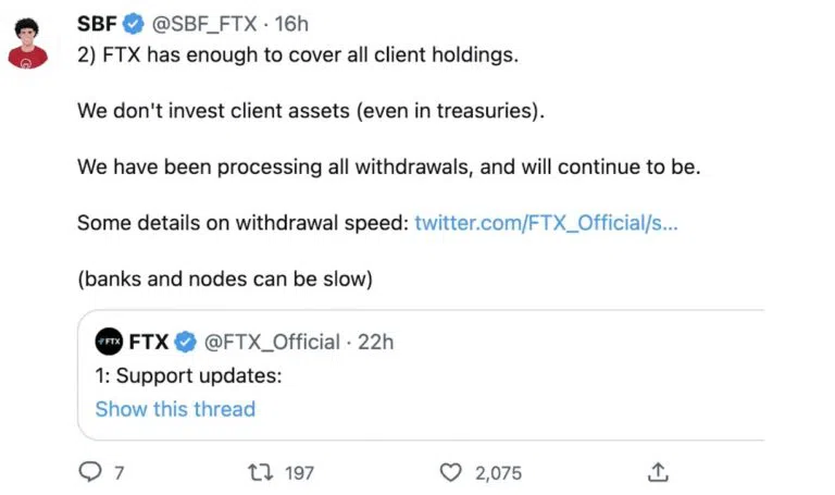 SBF a déclaré dans un tweet que l’exchange détenait suffisamment de réserves pour se remettre à flot. Les tweets de l’ancien milliardaire ont tous été supprimés quelques heures plus tard, mais vous pourrez les retrouver plus loin dans cet article.