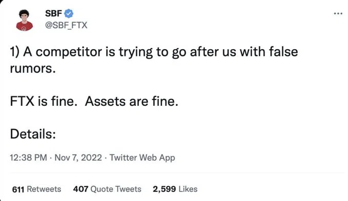 Afin de rassurer les investisseurs, SBF a tweeté le 7 novembre 2022 que sa plateforme crypto se portait bien. Quelques heures plus tard, il a supprimé son tweet.