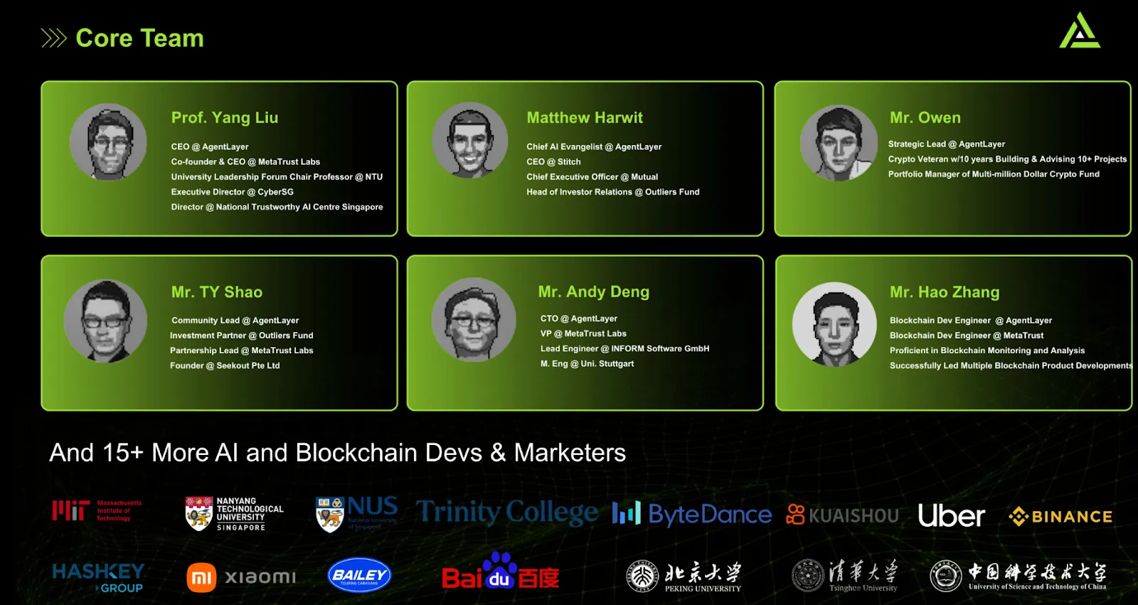 L’équipe principale d’AgentLayer est composée d’experts en solutions d’IA, en réseaux décentralisés et en technologie blockchain. Voici quelques-uns de ses principaux membres :