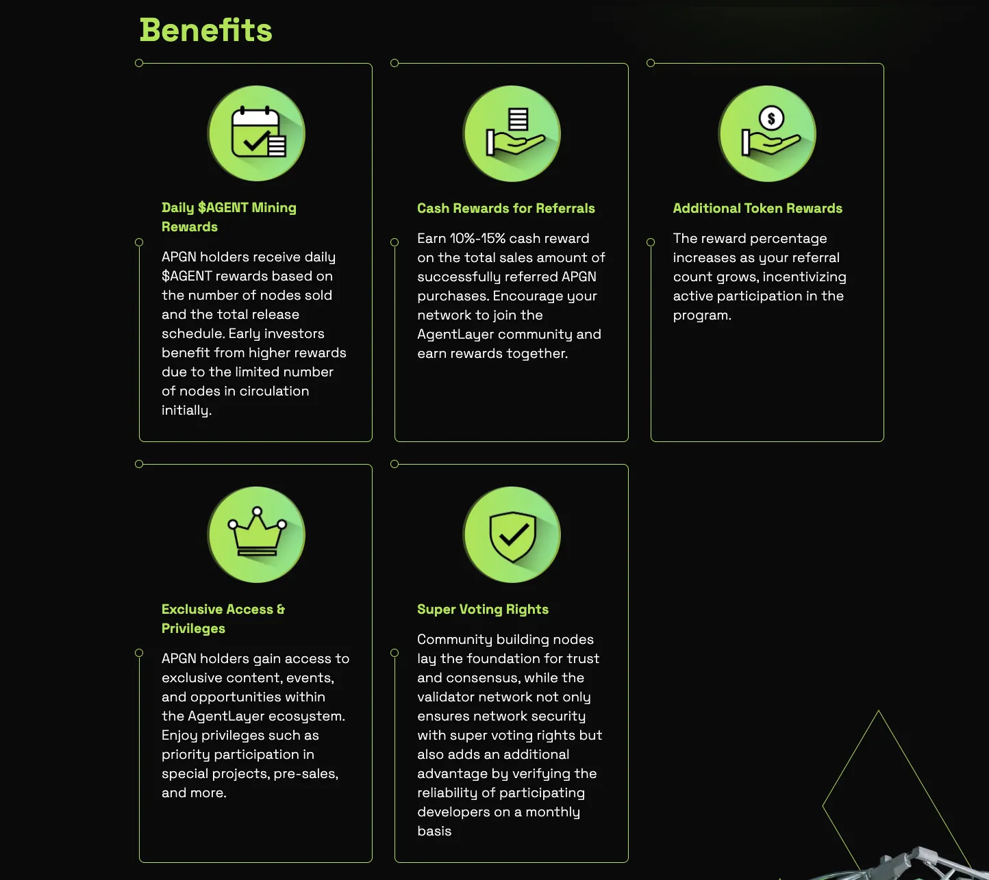 Même si la détention de tokens veAGENT offre des droits de gouvernance – et que les utilisateurs obtiennent en bloquant leurs tokens AGENT – AgentLayer propose également un palier de gouvernance premium, avec la permission des nœuds de gouvernance Premium d’AgentLayer.