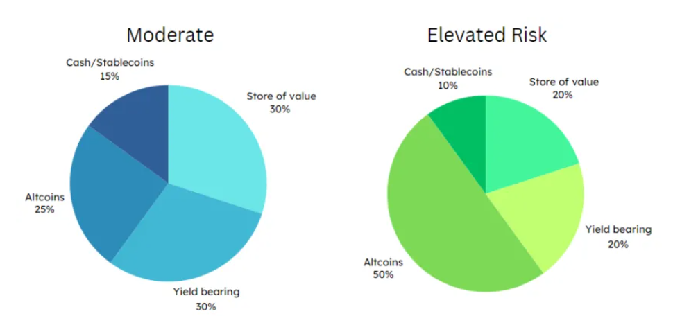- Espèces/stablecoins : Alors que les réserves de valeur sont considérées comme une protection contre l’inflation, les liquidités ou les équivalents de liquidités (stablecoins) sont considérés comme une protection contre la volatilité.