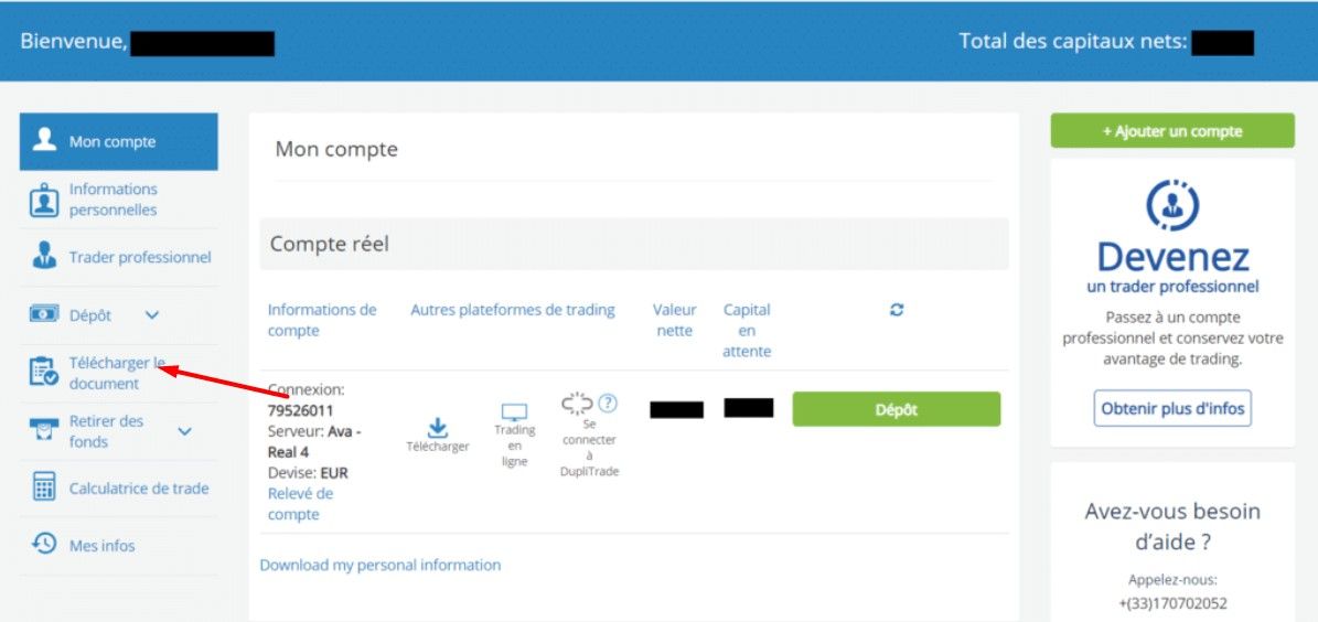 Si vous souhaitez accéder à toutes les options proposées par le courtier, vous devez vérifier votre compte. Par la suite, vous devrez transmettre un justificatif de domicile ainsi que votre carte d’identité à AvaTrade. Pour cela, cliquez sur “Téléchargez un document” dans la colonne de gauche de votre espace personnel puis implémentez les papiers nécessaires.