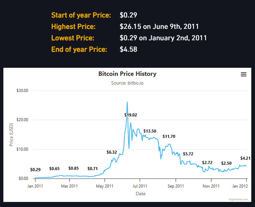 Notez qu’à l’époque, le cours de Bitcoin était encore à ses débuts. Il a commencé 2011 à seulement 0,29 $, a franchi 1 $ pour la première fois en février et a culminé à un modeste 26 $ en juin.
