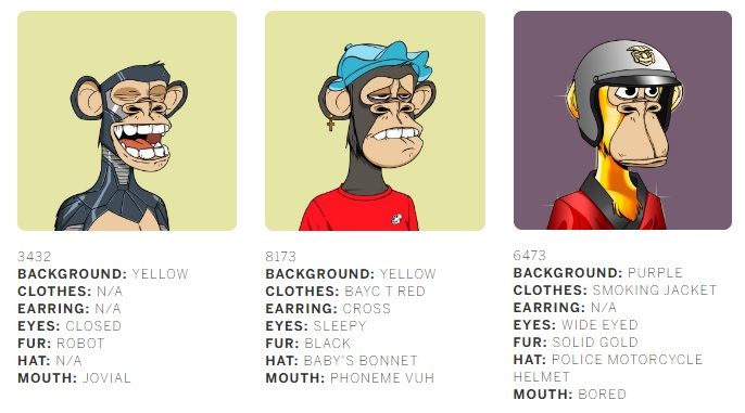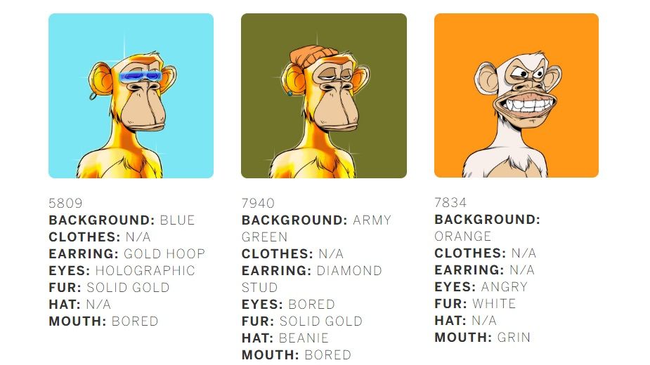 Cela signifie que si vous définissez un certain nombre de traits, vous obtiendrez plusieurs combinaisons, car elles seront générées de manière aléatoire. En regardant l’ensemble ci-dessous, il est facile de voir que chaque NFT Bored Apes Yacht Club possède sept traits.