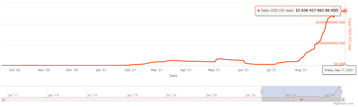 De fin juillet à mi-septembre, les ventes de NFT ont grimpé de 1 144 %, passant de 211,7 millions de dollars à 2,6 milliards de dollars.
