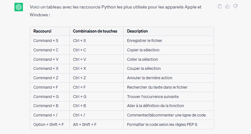 - Prompt : J’ai besoin que tu me fasses un tableau avec les raccourcis Python les plus utilisés pour les appareils Apple et Windows. Le tableau doit être clair et bien organisé. Il doit également comprendre le nom du raccourci, la combinaison de touches correspondante et une brève description de sa fonction.