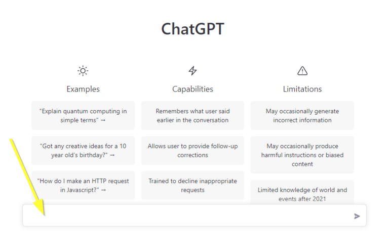 Pour discuter avec le chatbot, il vous suffit de saisir une question ou un message (voir la flèche jaune dans l’image ci-dessus). ChatGPT va ensuite étudier vos questions et leur contexte avant de vous donner une réponse. Sur la base de notre test, le chatbot ne prend que quelques secondes pour répondre (généralement moins de 10 secondes).