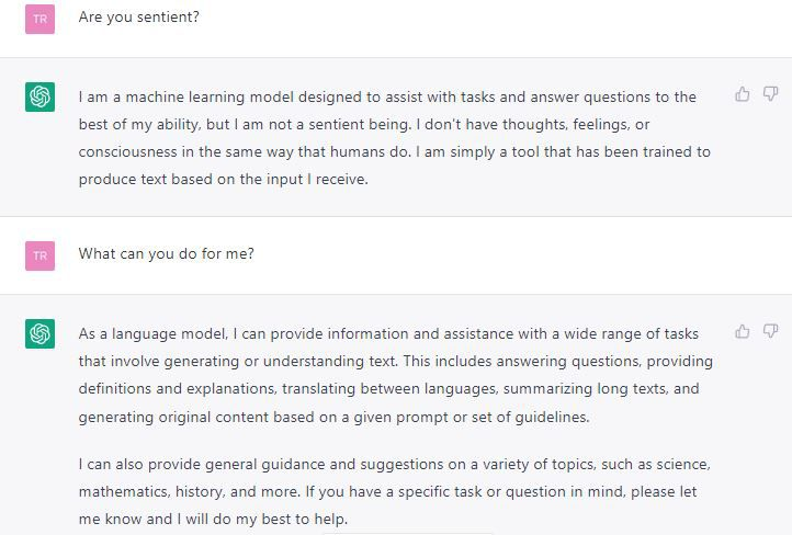 SponsoredLe chatbot est basé sur un modèle d’apprentissage et de traitement automatique des langues (NLP). Il s’appuie également sur le Generative Pre-trained Transformer 3 (GPT-3) d’OpenAI, l’un des modèles de langage autorégressifs les plus sophistiqués. La capture d’écran ci-dessous montre un exemple de conversation entre ChatGPT et un utilisateur :