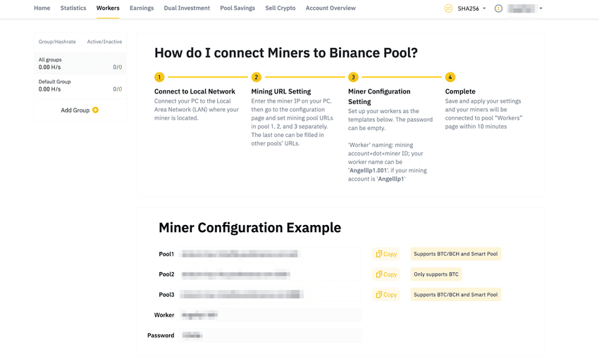 Il suffit de cliquer sur “Créer” pour poursuivre. Un guide vous sera ensuite présenté, lequel explique comment connecter vos mineurs au pool Binance et vous fournira des exemples de configurations appropriées.