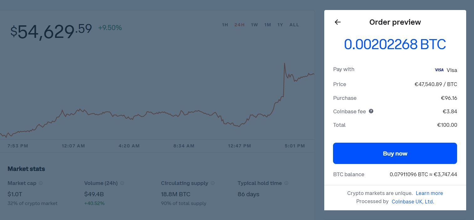 Si vous décidez de payer avec une carte de crédit ou de débit, vous devez chercher Bitcoin dans la liste des cryptos. Après l’avoir trouvé, ouvrez la page et entrez le montant que vous souhaitez acheter (en BTC ou en fiat). Ensuite, un aperçu de votre commande s’affichera sur votre écran et vous pourrez y retrouver les frais de l’exchange (voir l’image ci-dessous). Les frais sont soustraits du montant total que vous avez entré. Il s’agit là de l’un des frais les plus simples et les plus bas de tous les exchanges crypto où vous pouvez acheter des bitcoins.
