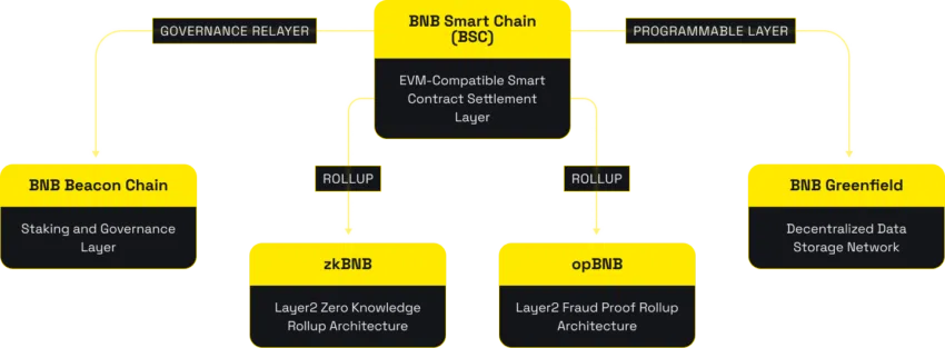 Après sa fusion, la chaîne BNB est devenue la chaine de référence qui fonctionne en parallèle avec la BSC (BNB Smart Chain) tout en servant également de couche de gouvernance ou de consensus. BSC est le contrat intelligent ou la couche d’exécution.