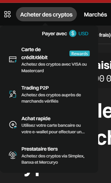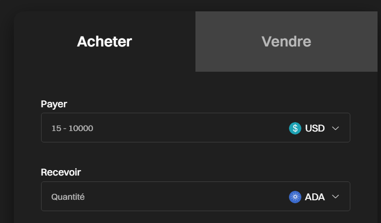2. Dans l’onglet “Acheter“, indiquez la somme en monnaie fiat que vous souhaitez dépenser pour acheter de l’ADA.
