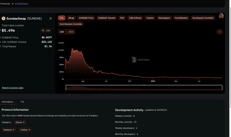 En ce qui concerne la DeFi, Cardano fait partie des 20 premières blockchains en termes de valeur totale verrouillée (TVL). Parmi les protocoles DeFi les plus populaires sur le réseau, on peut citer : ADAX, un DEX et convertisseurs de tokens ERC-20, et SundaeSwap, un exchange décentralisé basé sur un teneur de marché automatisé (AMM).