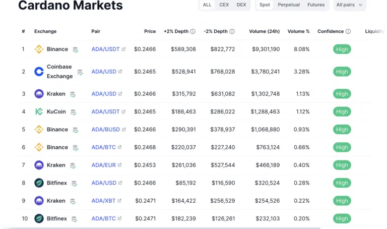 Comment acheter la crypto ADA sur un CEX ? Rien de plus simple ! Il vous suffit de vous inscrire et de suivre le processus KYC. Avant d’acheter Cardano, vous devez également vérifier la paire de trading qui vous intéresse et vous assurer qu’elle dispose d’une bonne liquidité. Si vous souhaitez toutefois acheter du Cardano de manière anonyme, vous pouvez passer par un DEX comme PancakeSwap.