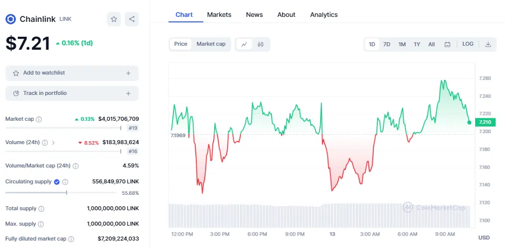 En ce qui concerne les principales crypto-monnaies du secteur en termes de capitalisation boursière, Chainlink se classe assez haut en 19ème place, avec une capitalisation boursière d’environ 4 milliards de dollars. En ce qui concerne ses volumes d’échange sur 24 heures, LINK est en 12ème place, avec un volume de 184 millions de dollars.