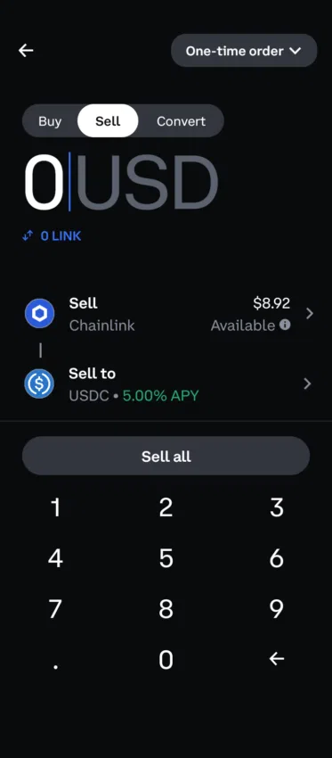 2. Ensuite, sous l’option Chainlink, choisissez l’option “Sell” puis indiquez le montant que vous souhaitez vendre.
