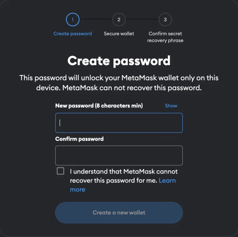 Une fois le wallet MetaMask installé, vous devez choisir un mot de passe. Ensuite, vous serez invité(e) à créer une phrase secrète ou phrase de départ. Celle-ci vous permettra de récupérer votre portefeuille en cas d’oubli ou de perte du mot de passe.