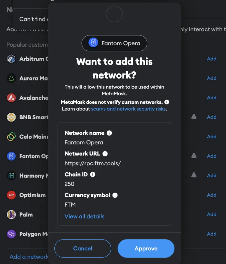 Pour commencer, cherchez le menu déroulant du réseau principal Ethereum. Ensuite, cliquez sur “Add Network”, ce qui vous redirigera vers la page “Add a Network”. Recherchez Fantom Opera dans la liste, puis cliquez sur “Add”. Les données du réseau devraient s’afficher de manière automatique. Mais si ce n’est pas le cas et que MetaMask vous demande de saisir le RPC, il vous suffit d’entrer les informations suivantes :