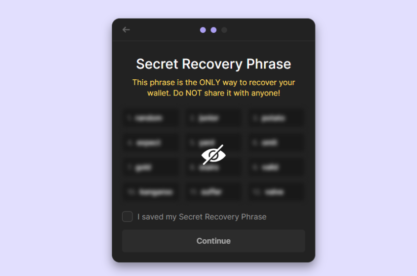 3. Enregistrer votre phrase de récupération secrète : Notez votre phrase de récupération pour continuer. Vous devrez saisir à nouveau la phrase dans l’ordre exact où elle vous a été donnée pour pouvoir passer à l’étape suivante.